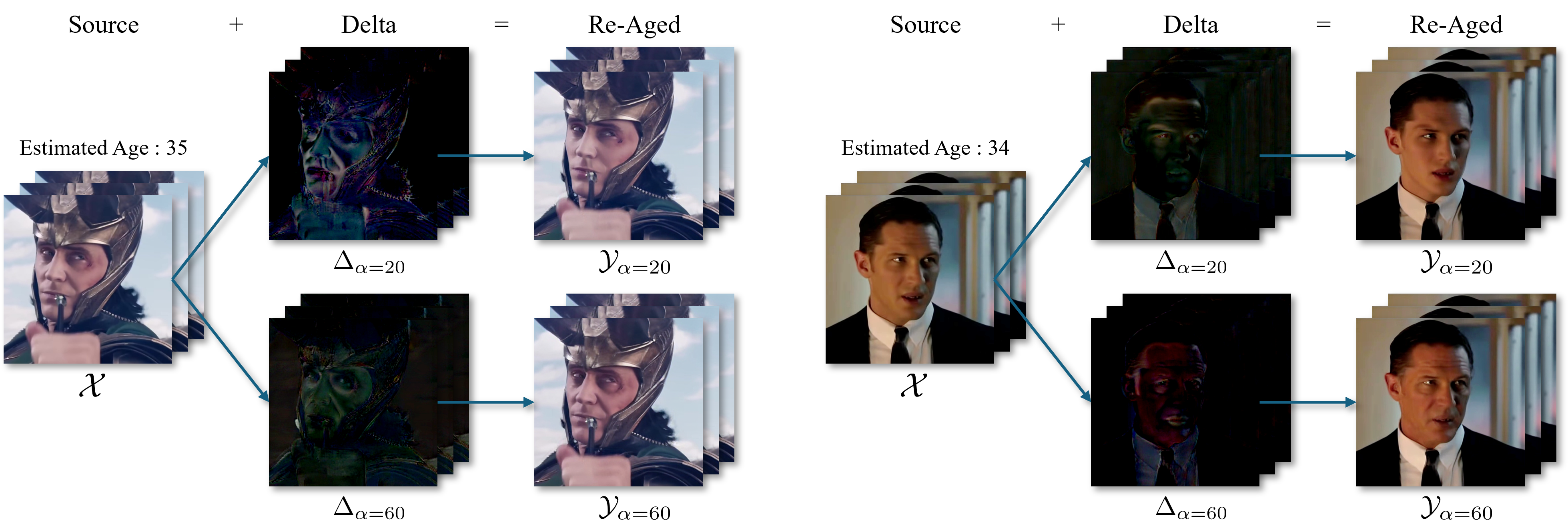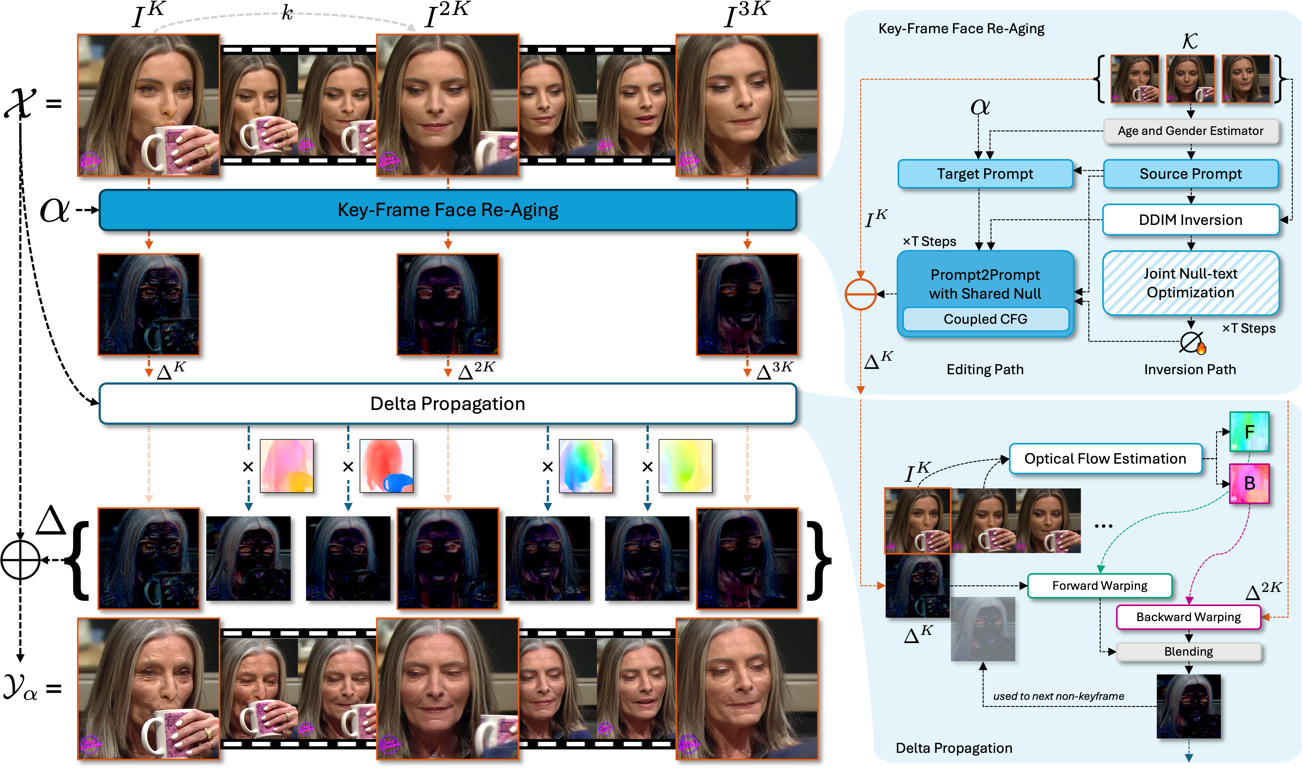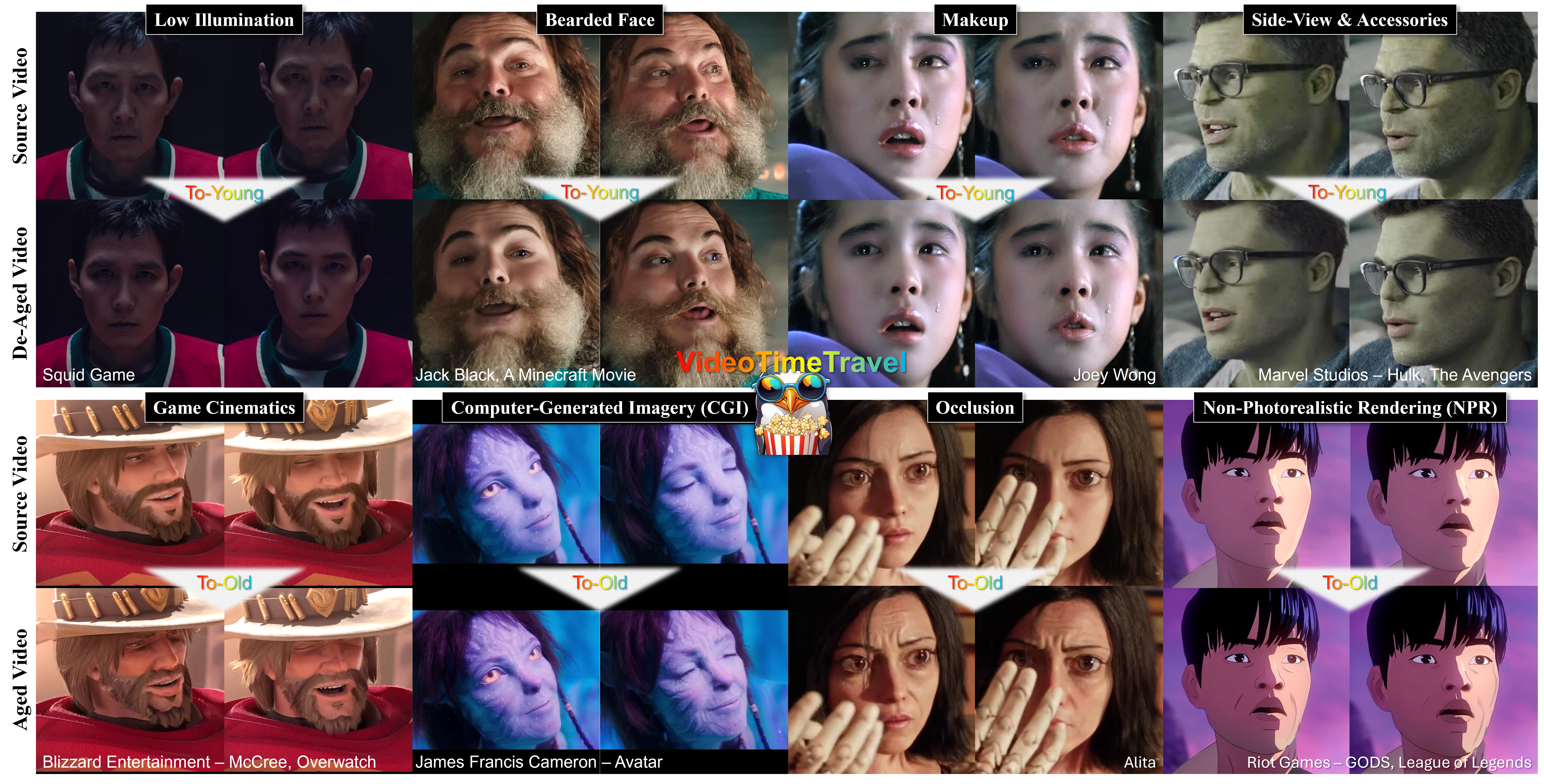 Machine learning-based face re-aging enables to automatically change age-related attributes given a target age, starkly reducing the need of manual labor among experienced artists. Variants of StyleGAN or diffusion models exhibited promising outcomes, but such approaches often lead to low fidelity on in-the-wild samples or still remain on image space. Thus, those video-level technics has lagged behind, despite video inference is imperative for practical aspects. To this end, we introduce diffusion-based re-aging models, marking the first attempt to incorporate diffusion scheme on video face re-aging task. Our optimization-based denoising approach can generate faithful re-aging results on various conditions, surpassing the shortcoming of GAN and VAE. Concretely, to improve global semantic coherence, joint null-text optimization is proposed where a single embedding is learned to coverage entire scene using keyframes. In addition, we leverage delta map which significantly amplifies image fidelity via residual manner. Thanks to the nature of delta, our system can lift the 2D diffusion models to video editing by neglecting age-irrelavant region and by propagating age-relavant pixels to adjacent frames through estimated optical flow without costly computing power. Our VideoTimeTravel ensures high fidelity, achieving unprecedented generalizable capability on in-the-wild cases such as occlusion, accessories and also satisfying industrial demand such as movie trailer, CGI.